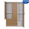 -Tủ khung thép cao cấp sơn tĩnh điện màu trắng S26 kết hợp với cánh gỗ công nghiệp phủ Melamine màu M60. -Tủ gồm 3 cánh mở và 3 ngăn kéo. Khoang cánh ngắn gồm 1 đợt di động và 1 suốt treo quần áo. Khoang cánh dài gồm 1 đợt di động, 1 suốt treo quần áo và 1 ngăn phụ có khóa.